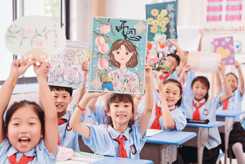 尊师重教是中华民族的优良传统。图为2024年9月9日,安徽省淮北市泉山路学校学生展示手工制作的教师节贺卡,表达对老师的感谢和祝福。 新华社发 万善朝/摄