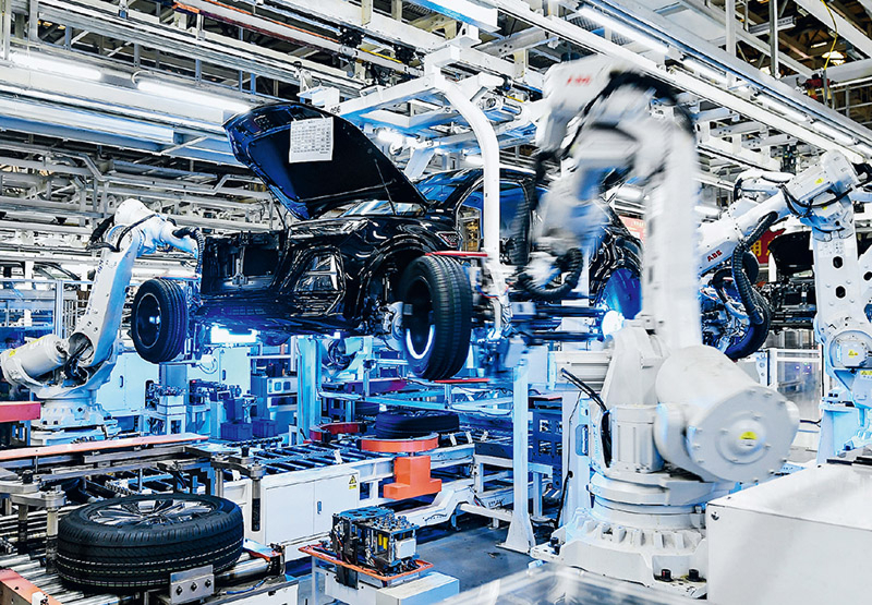 东北加大力度推进传统制造业数字化改造。图为2024年4月24日,在吉林长春中国一汽红旗制造中心蔚山厂区总装车间内,生产线上的智能机器人对车辆轮胎轮毂进行装配作业。新华社记者 许畅/摄