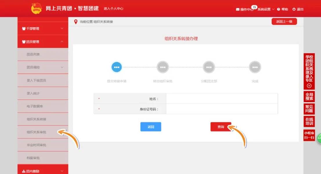 2.点击左侧菜单栏“团员管理”——“组织关系转接”,在中间页面选择“办理转入”并点击右侧“办理转入”。