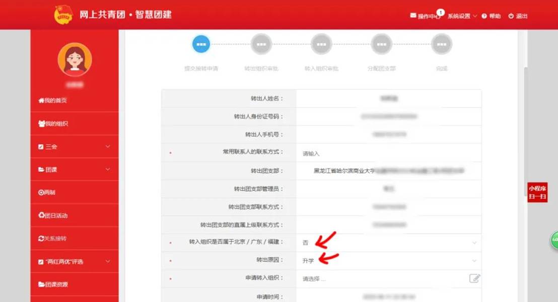 3.“转入组织是否属于北京/广东/福建”选择“否”,“接转原因”选择“升学”。