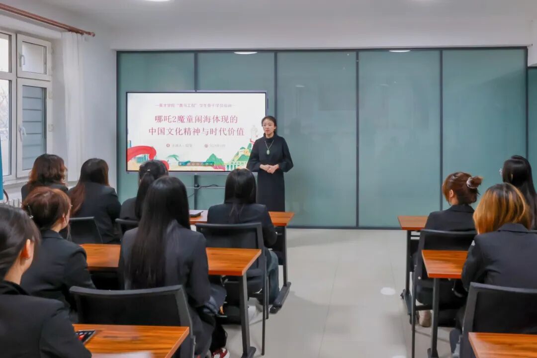 在文化传承与创新成为时代发展重要课题的当下,中国传统文化如何在现代社会焕发生机,是备受关注的焦点。哪吒这一经典文化形象,历经千年演变,在当代影视作品中大放异彩,其背后的文化底蕴与时代价值亟待深入挖掘。为引导青年学子深刻理解中国文化精神、传承优秀传统文化,2025年3月19日,英才学院于求真社区开展“青马工程”学生骨干学员培训活动,院团委书记段莹老师作为主讲人,带领学员们深入剖析《哪吒之魔童闹海》体现的文化内涵与时代价值。
