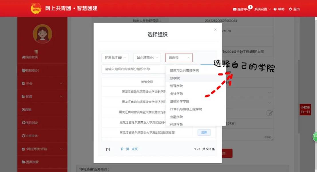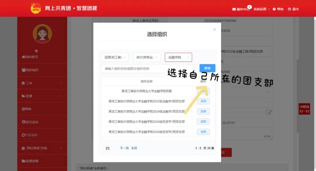 4.“申请转入组织选择团黑龙江省委哈尔滨商业大学团委——所在学院团委——所在班级团支部,点击提交,等待审批即可。