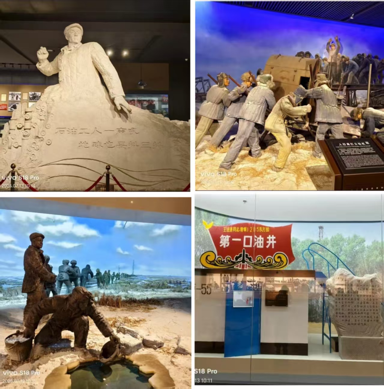 走进铁人王进喜纪念馆,全体实践团成员便被那片镌刻着奋斗印记的精神所深深感染。墙上的老照片、展柜里的旧工具、复原的“人拉肩扛”钻井场景……一件件史料实物,活生生勾勒出当年石油工人的奋斗群像。“爱国、创业、求实、奉献”这八个字,不再是书本上的概念——它是钻井台上跳动的火焰,是“宁可少活二十年,拼命也要拿下大油田”的震天誓言,更是穿越几十年依旧闪亮的信仰路标。实践成员们在静思中顿悟,这精神从不是标本,而是照鉴当下的明镜:于青年,是把“为国分忧”化为深耕的执着,让“艰苦奋斗”融入征程的步履。传承不是照着过去画圈圈,而是让青春和这份精神撞出火花,在强国路上写出属于我们这代人的“创业新故事”。