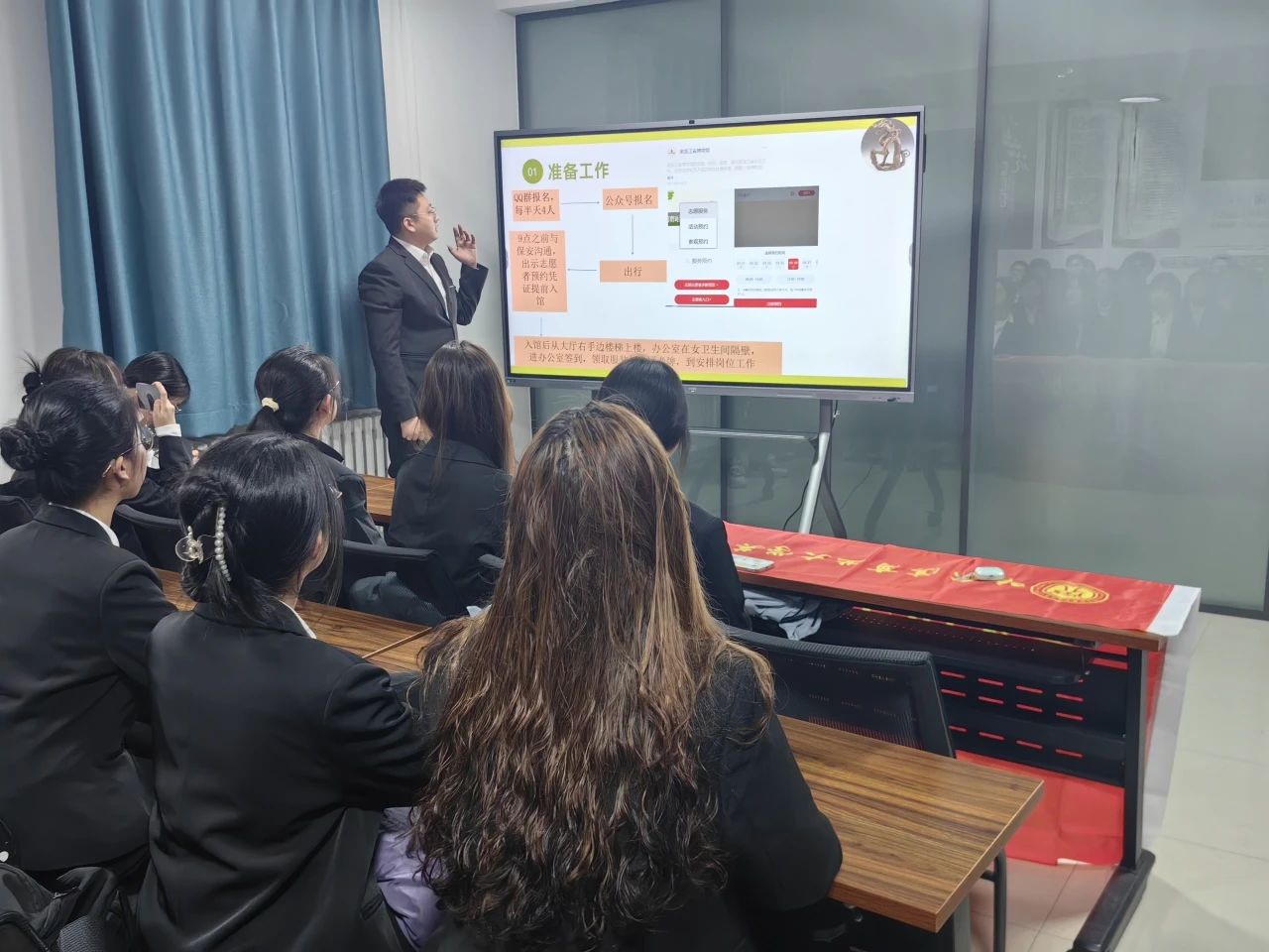 刘成成同学详细地向志愿者们介绍了黑龙江省博物馆岗前培训流程、黑龙江省博物馆的各个服务地点以及打卡机的具体位置,列举出作为导览志愿者可能会遇到的问题,并一一给出了解答。最后,以自己的亲身经历向志愿者们分享在做省博志愿者时所遇到的意外惊喜,让志愿者们对志愿服务工作充满了期待,也让志愿者们对志愿服务的意义有了更全面的认识。