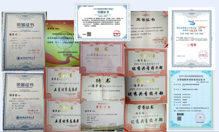 大学期间累积获得了国际级奖项2项,国家级奖项2项,省校级奖项10余项,曾获美国大学生数学建模竞赛二等奖、全国大学生英语竞赛一等奖、哈尔滨商业大学特等奖学金等奖项,以第二作者身份发表论文一篇。