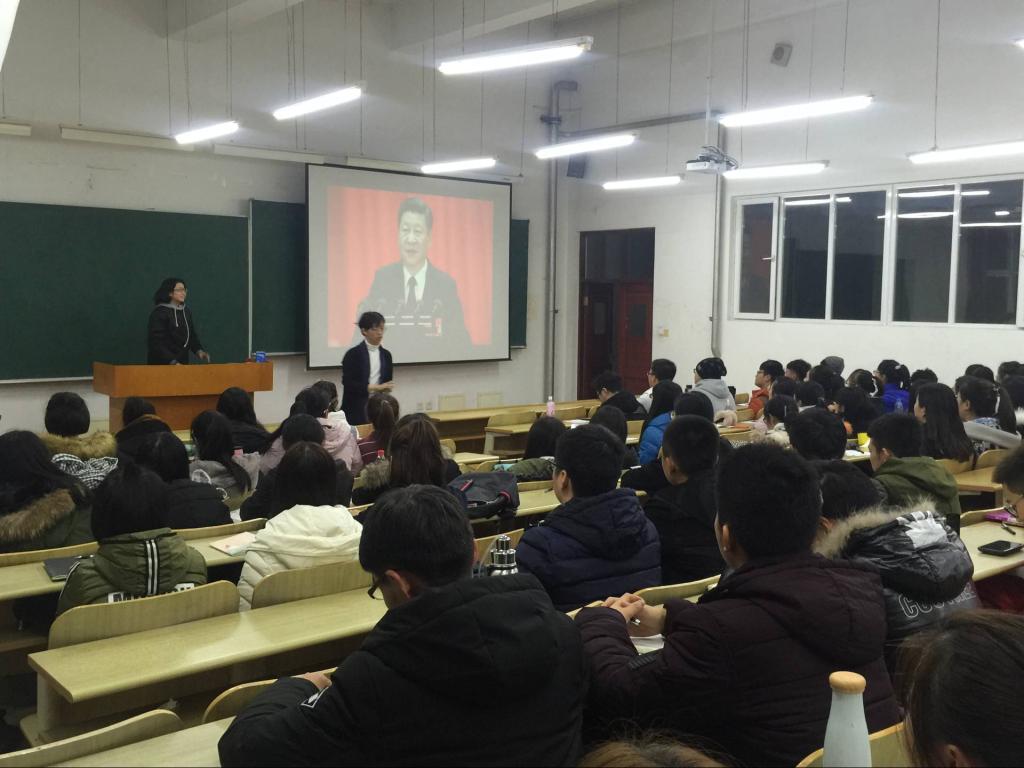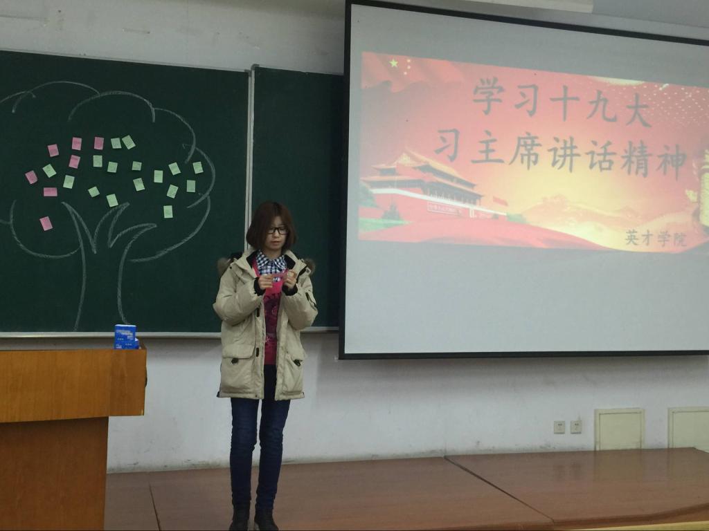 会上,学“习”社成员将习近平总书记十九大报告中的新思想、新内容和新理念对同学们进行详细解读,并且组织在场的同学们以小组为单位进行讨论,各组学生踊跃发言,说出自己对于十九大报告精神的理解;随后,各班入党积极分子发挥带头作用,结合十九大新修订的党章,畅谈自己的体会,并将自己对祖国的寄语粘贴到许愿树上;最后,全体学生观看了相关会议视频,在场的同学们都深切感受到实现“两个一百年”奋斗目标是与自己息息相关的,纷纷表示作为当代大学生,一定把握历史际遇,担当起时代赋予的历史使命,勤勉学习,认真工作,为实现中华民族的伟大复兴而奋斗。