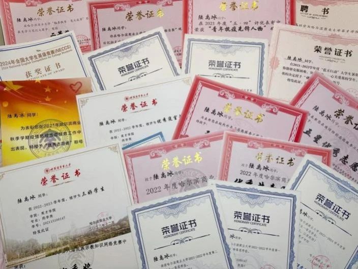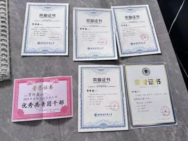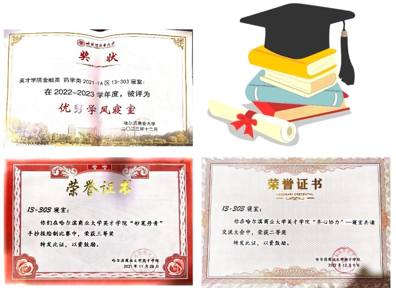 全国大学生数学竞赛(非数学类B类)一等奖,多次获得校级奖学金,在“蓝天行动”大学生暑假支教活动中获得优秀志愿者称号;多次获得五星优秀志愿者称号,荣获2022年大学生创新创业联盟优秀部员称号;在“翰墨飘香,笔尖筑梦”最美笔记大赛中荣获二等奖;曾获2023年度哈尔滨商业大学优秀共青团干部;2023-2024学年优秀学生干部称号。