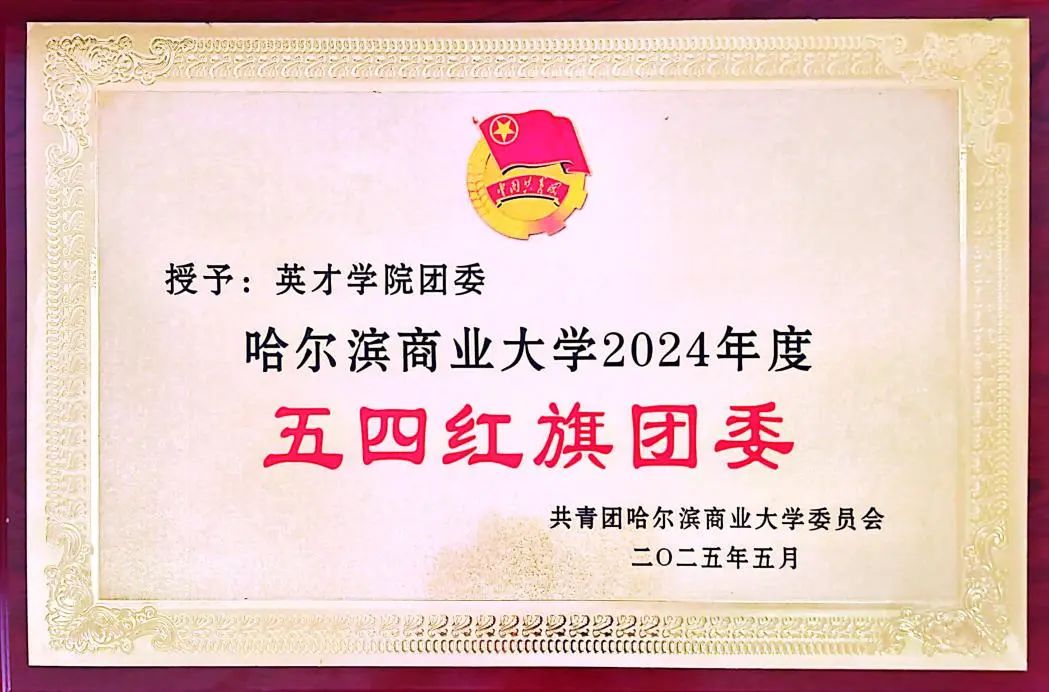 在过去一年里,英才学院在各项工作、活动中涌现出许多先进集体和突出个人,在此次表彰大会上,学院团委获2024年度“五四红旗团委”荣誉称号,院团委书记段莹获哈尔滨商业大学“优秀共青团干部”荣誉称号,英才学院2023级中药学(本硕班)1班团支部获得“五四红旗示范团支部”荣誉称号,英才学院“北大荒精神传承者”团队获得“暑期‘三下乡’社会实践优秀团队”荣誉称号。