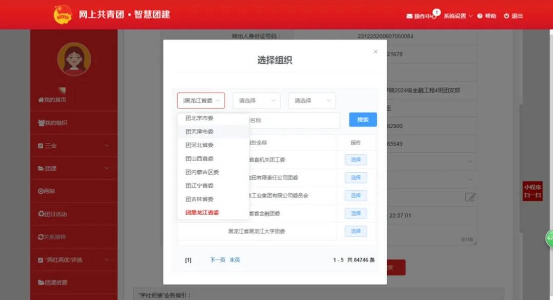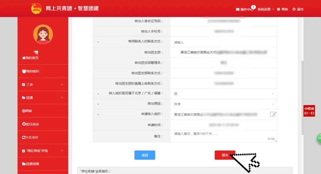 4.“申请转入组织”选择“团黑龙江省委—哈尔滨商业大学团委——所在学院团委——所在班级团支部”,点击“提交”,等待审批即可。