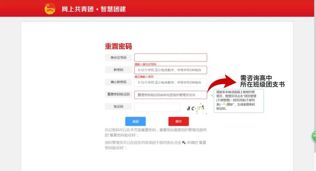注意:如忘记密码,则需重置密码,可联系高中所在班级团支部团支书生成密码重置码。
