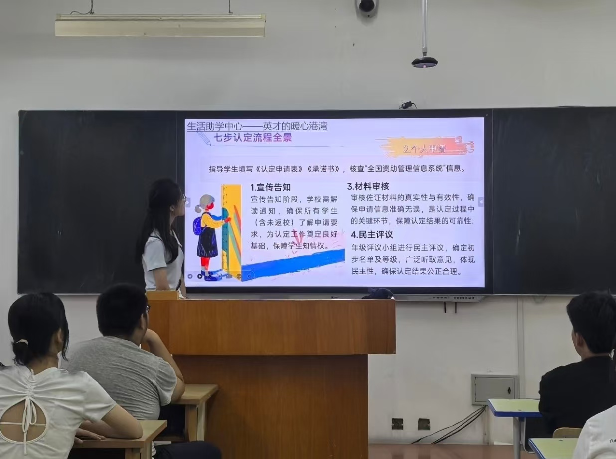 乐慧雯同学还对“七步认定流程全景”进行了详细介绍。从核查信息,到宣传告知,再到材料审核、民主评议等环节,流程清晰规范。这一系列严谨的步骤,既维护了学生权益,又保障了认定工作的公平公正,为家庭经济困难学生顺利求学提供了坚实保障。