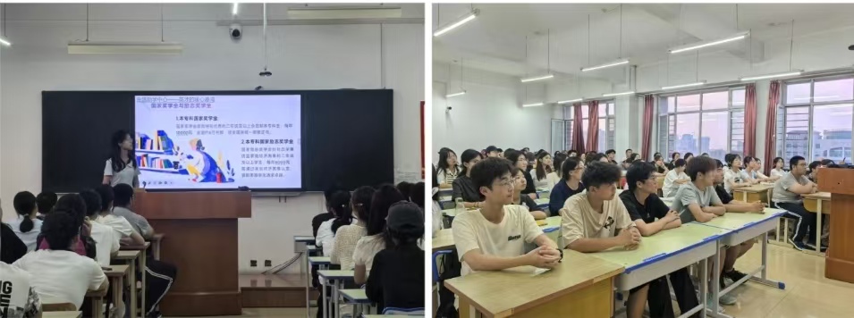 生活助学中心的乐慧雯同学向同学们详细地讲解了关于本专科国家奖学金与本专科国家励志奖学金的具体内容,以国家奖助学金、国家助学贷款等多种方式并举的资助政策体系。既有针对特别优秀学子的奖学金,也有面向家庭经济困难却好学奋进同学的励志奖学金,这些政策为学子们插上助梦的翅膀,让大家能在求学路上更坚定地前行。