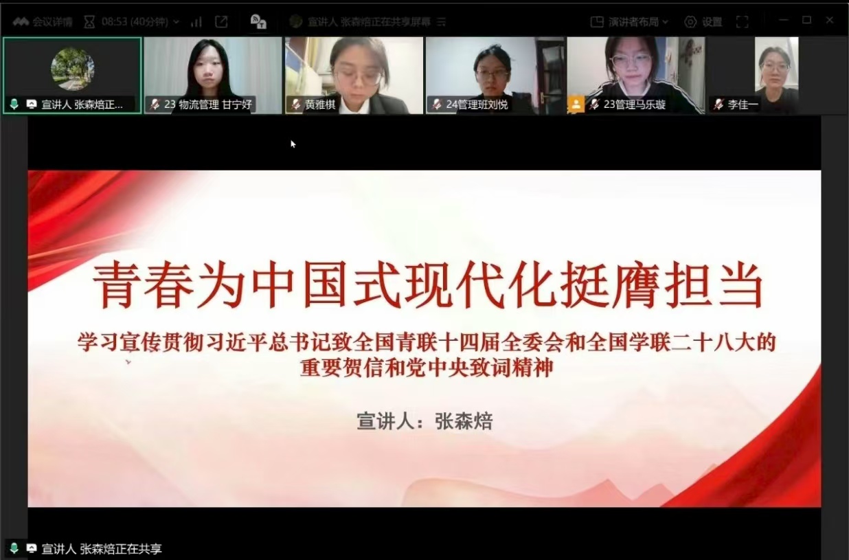 为深入贯彻习近平总书记致全国青联十四届全委会和全国学联二十八大的重要贺信和党中央致词精神,2025年7月13日,校级“青马工程”学生骨干成员张森焙作为领学人,带领我院“青马工程”学生骨干学员开展以“青春为中国式现代化挺膺担当”为主题的青马工程理论宣讲活动。