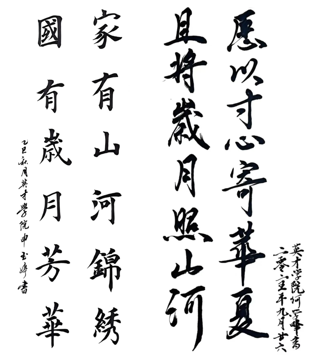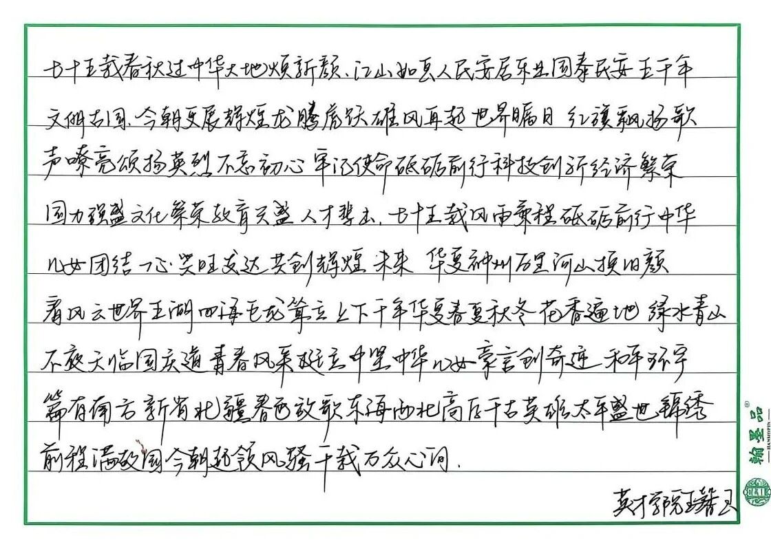 青春执笔,礼赞祖国。英才学子们以书法寄情,将对祖国的热爱化作笔下的时代新风与盛世图景,用艺术创作展现了新时代青年的蓬勃力量。