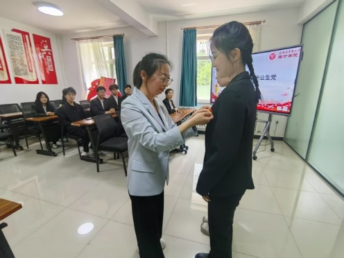 党课结束后,吴竞老师为毕业生们佩戴党徽、发放党章以及毕业生党员提示卡,激励他们时刻牢记党员身份,不忘初心,砥砺前行。